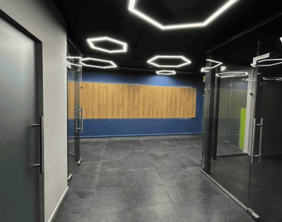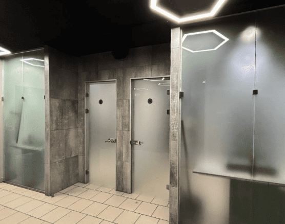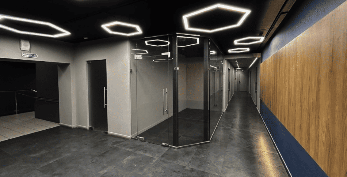 Керамогранит; потолочные системы — Грильято; стеновые панели — UNIPROCK
